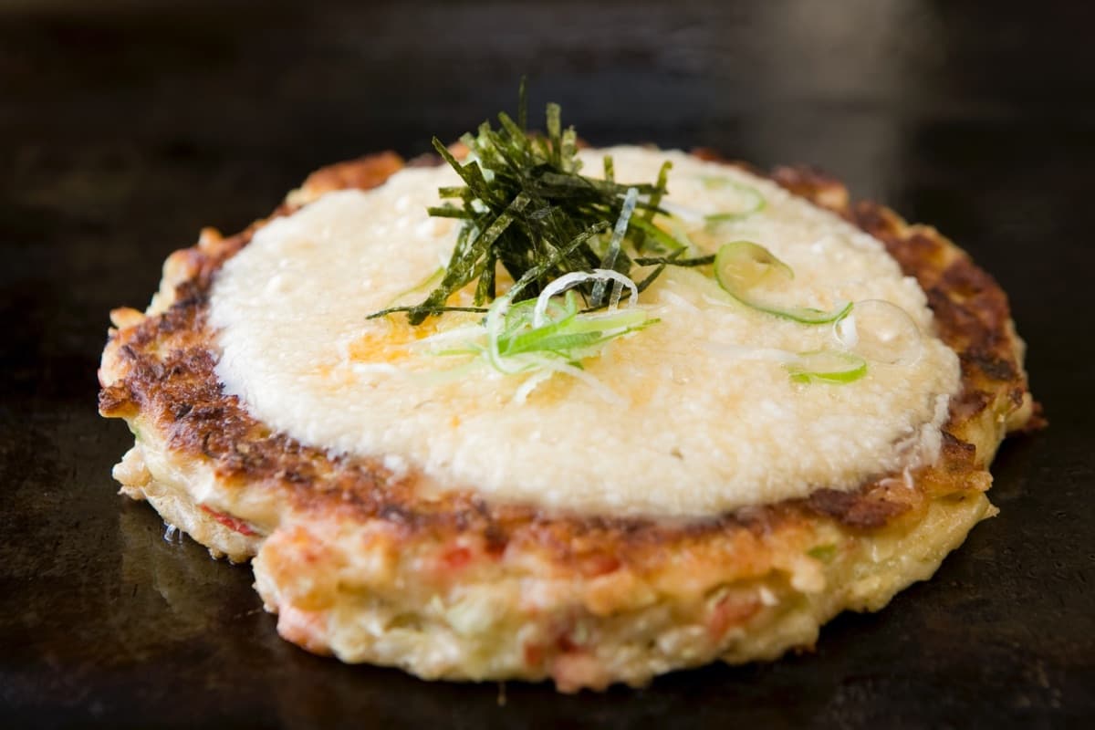 焼き上がったお好み焼きにソースの代わりに白だしベースの特製とろろ芋ソースをかけてどうぞ。焼くのが苦手!と言う方にはこちらで焼いて提供する事も出来ますので、ご要望下さい。混雑時はお時間を頂きますm(_ _)m