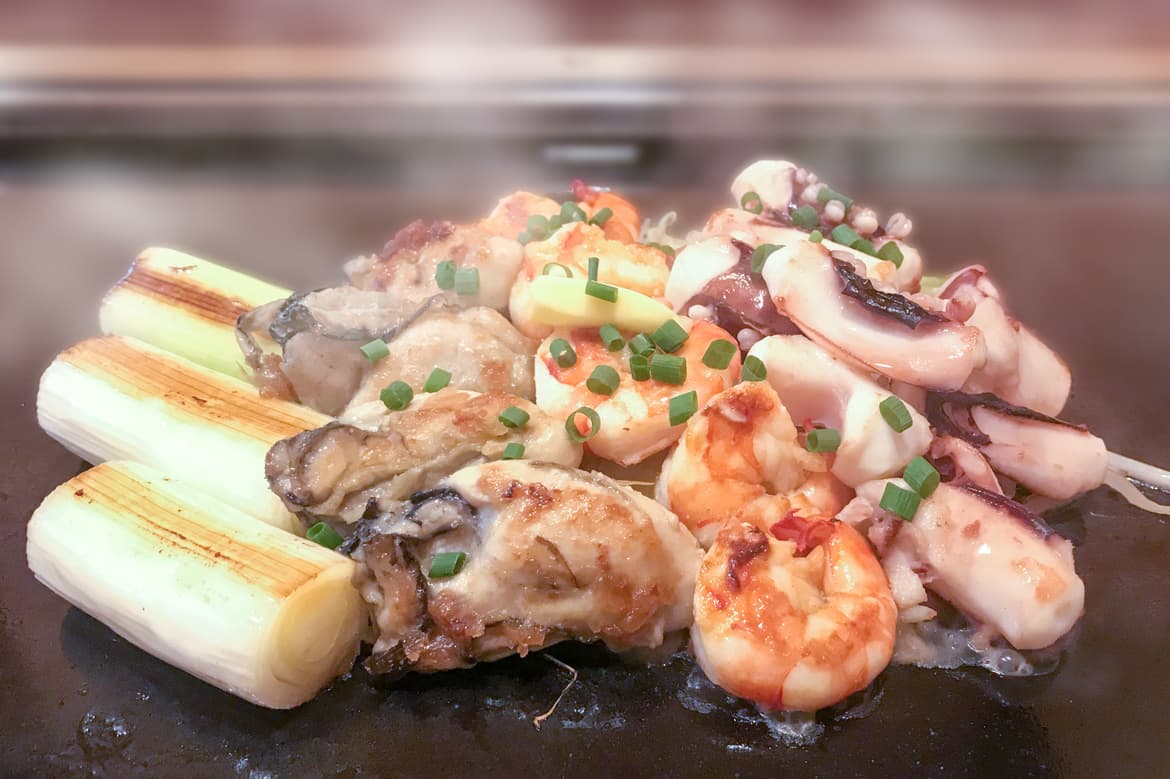 豊洲市場から仕入れている魚介類。豚肉も産地直送のブランド豚「和豚もちぶた」を使用。イベリコ豚や牛ホルモン焼きは自家製味噌ダレで味付け、またプリプリの大きな牡蠣まで。焼きそばは中華麺ではなく、あえて大阪の製麺所から直送のちゃんぽん麺を使用。ちょい太麺の焼きそばは「焼きちゃんぽん」と言う名でラインナップ。